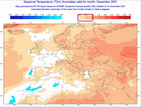 L’anomalia termica al rialzo, secondo il prestigioso centro di calcolo ECMWF, si collocherebbe tra +0.5 e +1° a scala nazionale, mentre i picchi massimi di scostamento al rialzo si avrebbero sull’Europa orientale e la vicina Russia. Temperature in media o leggermente al di sotto potrebbero essere di competenza dell’Europa occidentale, sottintendendo forse un pattern di tipo nord atlantico.