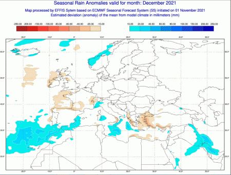 Dal punto di vista delle piogge, questa la situazione estrapolata sempre per l’intero mese di dicembre: