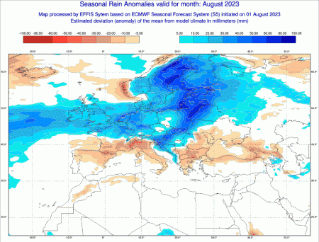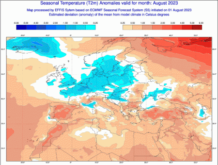 Sarà un agosto nel complesso sopramedia, con scostamenti dai valori normali compresi tra il mezzo grado e il grado. Solo l’estremo lembo nord orientale e parte della Sardegna avrà temperature in media. Il resto d’Europa avrà invece valori termici sottomedia.