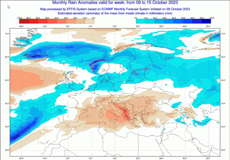 La prima mappa mostra il quadro delle anomalie pluviometriche attese in Italia da oggi (lunedi 9 ottobre) fino al 15 ottobre, ovvero per tutta questa settimana – consigliamo sempre di ingrandire le mappe per avere un migliore riscontro visivo.