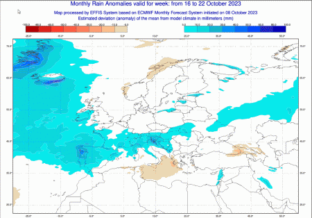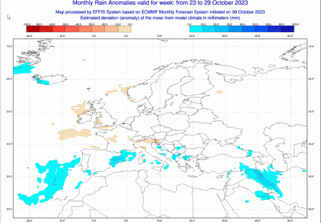 Infine, la media precipitativa estrapolata sempre dal modello ECMWF nel lasso temporale compreso tra il 23 e il 29 ottobre: