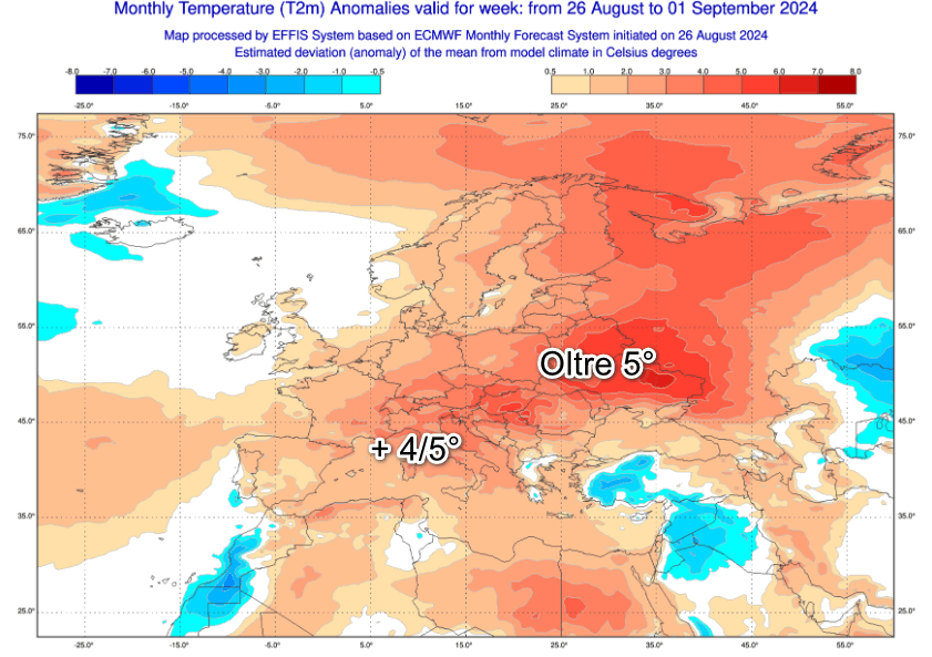 Si evincono anomalie termiche al rialzo in Italia, comprese tra 4 e 5°. Sui Paesi dell’Europa centro-orientale andrà anche peggio, con esuberi termici ben oltre i 5°.