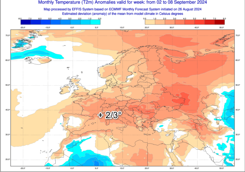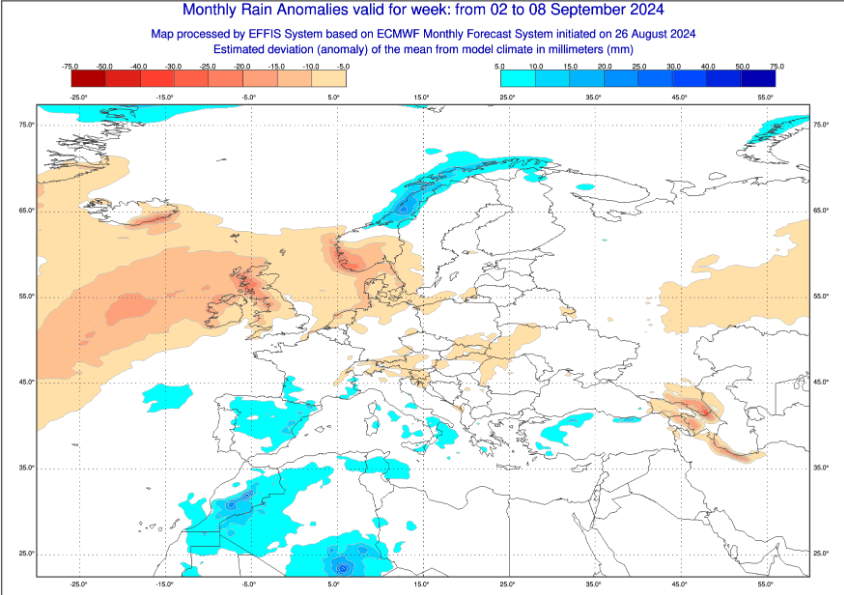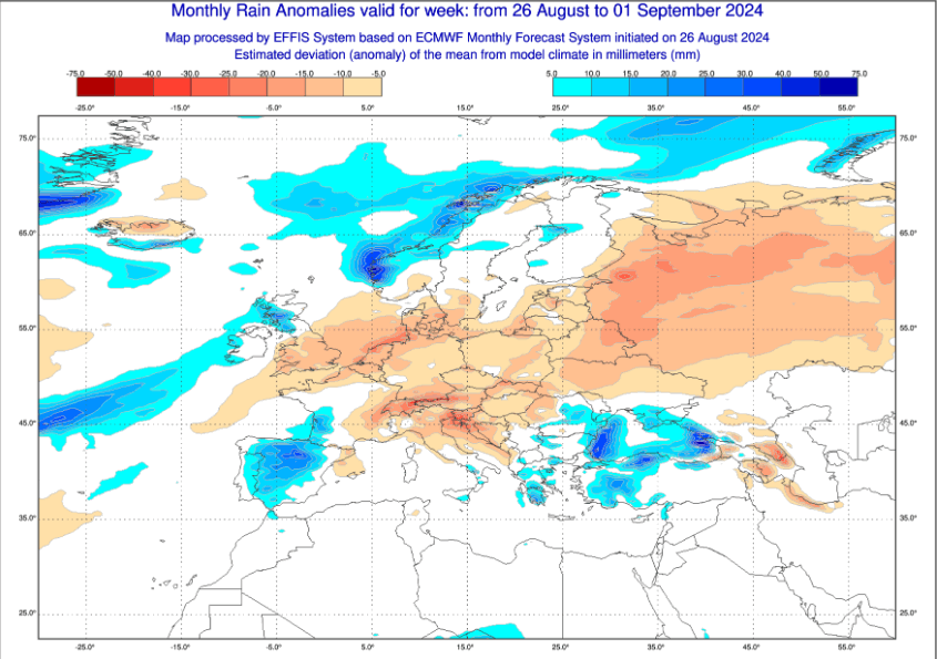 Infine, queste sono le anomalie precipitative previste nel medesimo lasso di tempo (2-8 settembre):