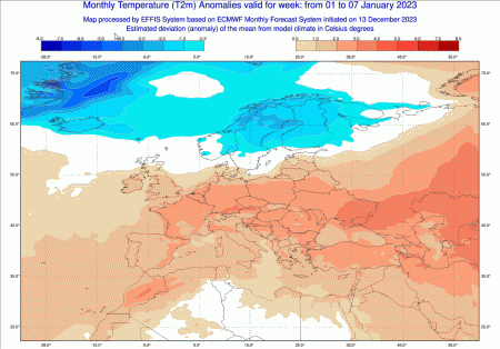 La prima mappa mostra le anomalie termiche attese in Europa nel lasso temporale compreso tra il giorno 1 e il giorno 7 gennaio – consigliamo sempre di ingrandire le immagini per avere un migliore riscontro visivo.