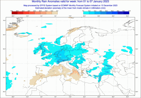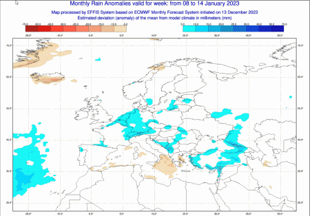Sul fronte pluviometrico, queste sono le anomalie previste dal modello per il medesimo lasso temporale:
