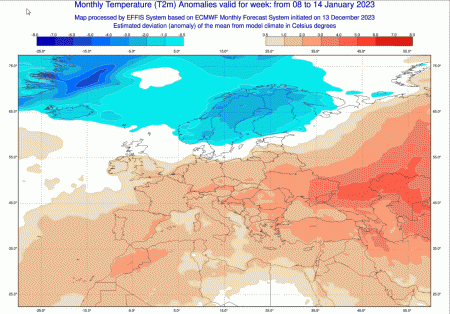 Andando avanti, queste sono le anomalie termiche estrapolate dal medesimo modello nel lasso temporale compreso tra il giorno 8 e il 14 gennaio: