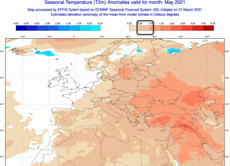Come potrebbe comportarsi il mese di maggio dal punto di vista termico in Europa ed in Italia? Ecco la mappa: