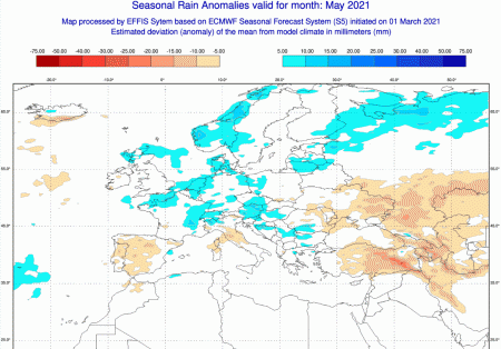 Il modello sembra non avere dubbi circa un mese di maggio in gran parte sopramedia sul nostro Continente, anche in modo spiccato sui settori più orientali. Risulterebbe invece in media solo sulle Isole Britanniche, il nord della Francia, l’Olanda, il Belgio e parte della Penisola Scandinava.