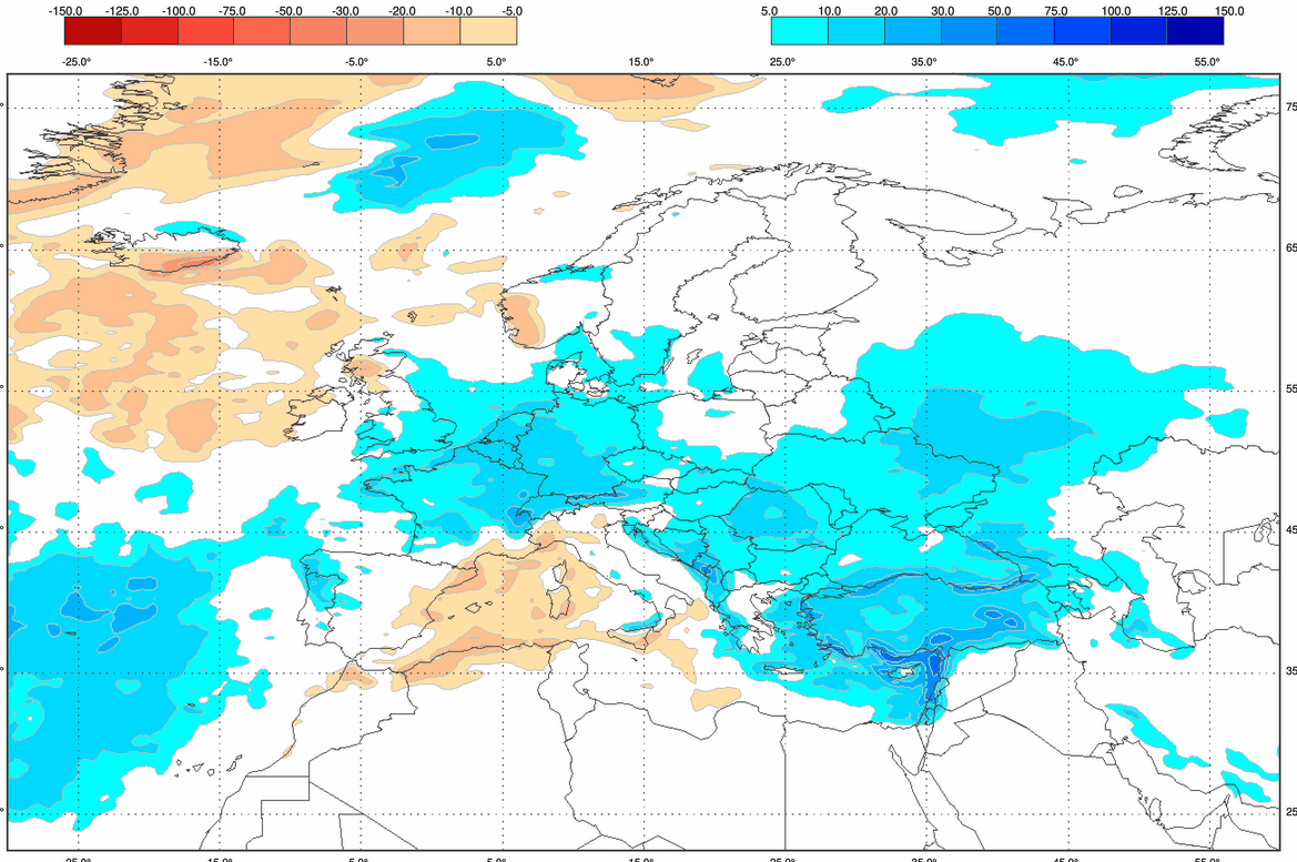 Praticamente su tutta l’Italia avremo temperature sopra media tra il mezzo grado e il grado. L’unica area sotto media a livello europeo sembra essere la parte orientale della Scandinavia.
