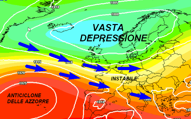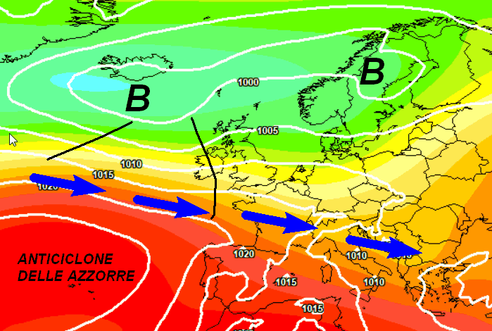 Oltre all’alta pressione delle Azzorre che non avrà la forza di estendersi fino a noi, si nota la completa assenza dell’alta pressione africana sul Mediterraneo. Sull’Italia sarà presente infatti un flusso umido ed instabile tra ovest e nord-ovest che metterà sotto instabilità gran parte del settentrione e del centro, sotto l’egida di temperature non calde.