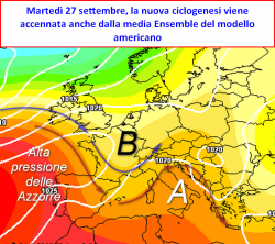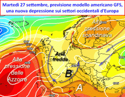 Pur nella straordinaria tenacia dimostrata quest’anno dall’anticiclone delle Azzorre arroccato sull’Europa occidentale, un nuovo passaggio perturbato proveniente da ovest, viene quest’oggi messo in evidenza dalla previsione del modello americano GFS. In realtà è già qualche giorno che questa dinamica perturbata viene inquadrata dai modelli nel periodo compreso tra lunedì 26 e martedì 27 settembre; inizialmente il passaggio di questa vistosa ondulazione era però previsto "mancare" il bersaglio del Mediterraneo, interessando in primis la Penisola Iberica per poi sfilare lontana dall’Italia, limitandosi ad interessare il mare del Nord e la Penisola Scandinava.
