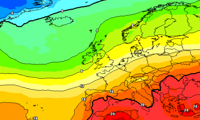Ed ecco il quadro termico a 1500m per il periodo in oggetto che, come vedete, favorisce sempre condizioni di caldo estivo ma non più con i valori eccezionali che abbiamo sperimentato per davvero troppi giorni tra fine luglio e la prima parte di agosto: