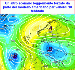 Il modello americano rilancia, per ora sotto traccia, l'ipotesi di una interazione tra l'aria gelida in arrivo dall'est e le correnti perturbate atlantiche.