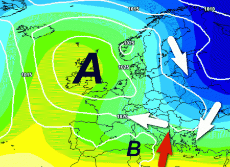 Alta pressione con centro sul Regno Unito, alito GELIDO da est (frecce bianche) ed intrusioni più miti da sud (freccia rossa) a scorrere sopra la suddetta aria fredda. Sarebbe una situazione da nevicate a quote molto basse, se non in pianura, su diverse aree della nostra Penisola, in particolare al centro e al nord.