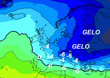Sull’Italia vengono mostrate isoterme comprese tra -4 e -6° al nord e al centro, con gelo massivo più ad est. L’isoterma 0° toccherebbe invece la Sicilia e il sud della Sardegna.