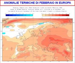 Anche per il mese di febbraio, il modello europeo vede esuberi termici più o meno marcati in Europa. Solo alcune zone dell’Europa settentrionale e del nord Atlantico vedrebbero temperature al di sotto della media (terza mappa).