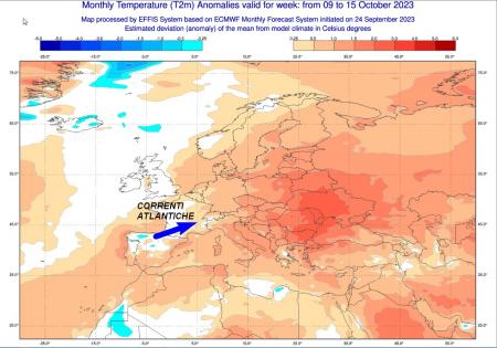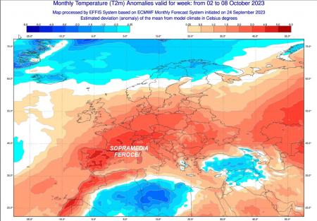 Si tratterà dell’ennesimo mostro anticiclonico che presenterà al suo interno temperature assolutamente fuori norma per il periodo. La prima mappa mostra le anomalie termiche che vi saranno in Europa nel lasso temporale compreso tra il 2 e l’8 di ottobre; consigliamo di ingrandire le immagini per avere un migliore riscontro visivo: