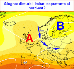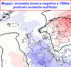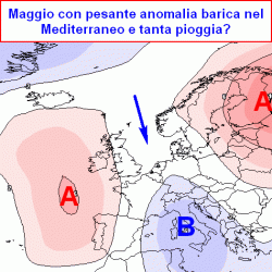 per il mese di maggio: anche in questo caso risulterebbe evidente una marcata anomalia barica, con due zone di alta pressione a fare da cuscinetto ad un canale depressionario che affonderà nel cuore del Mediterraneo, originando spesso delle depressioni sull’Italia.
