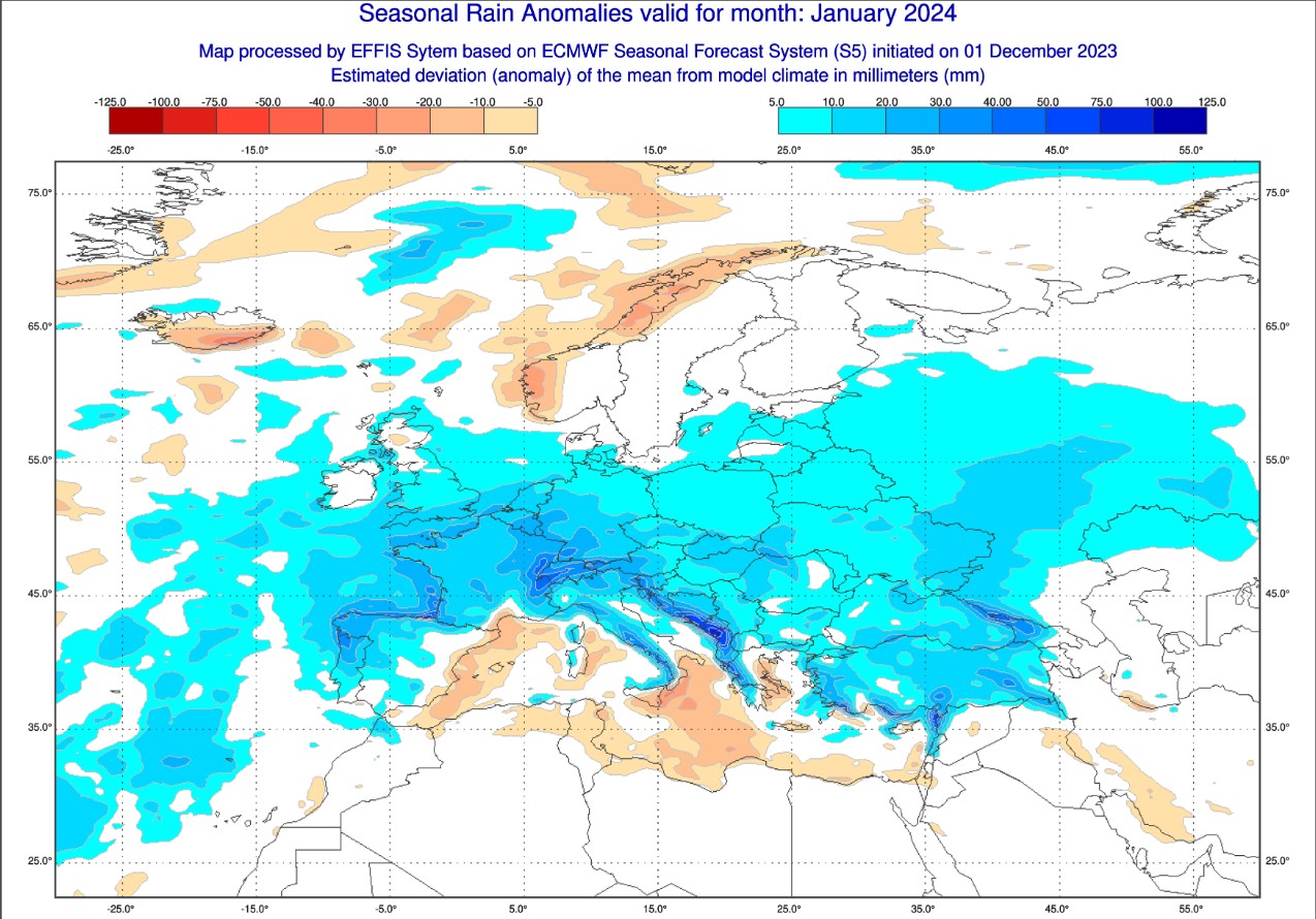 Passiamo ora alle anomalie pluviometriche attese in Europa nell’arco di gennaio 2024: