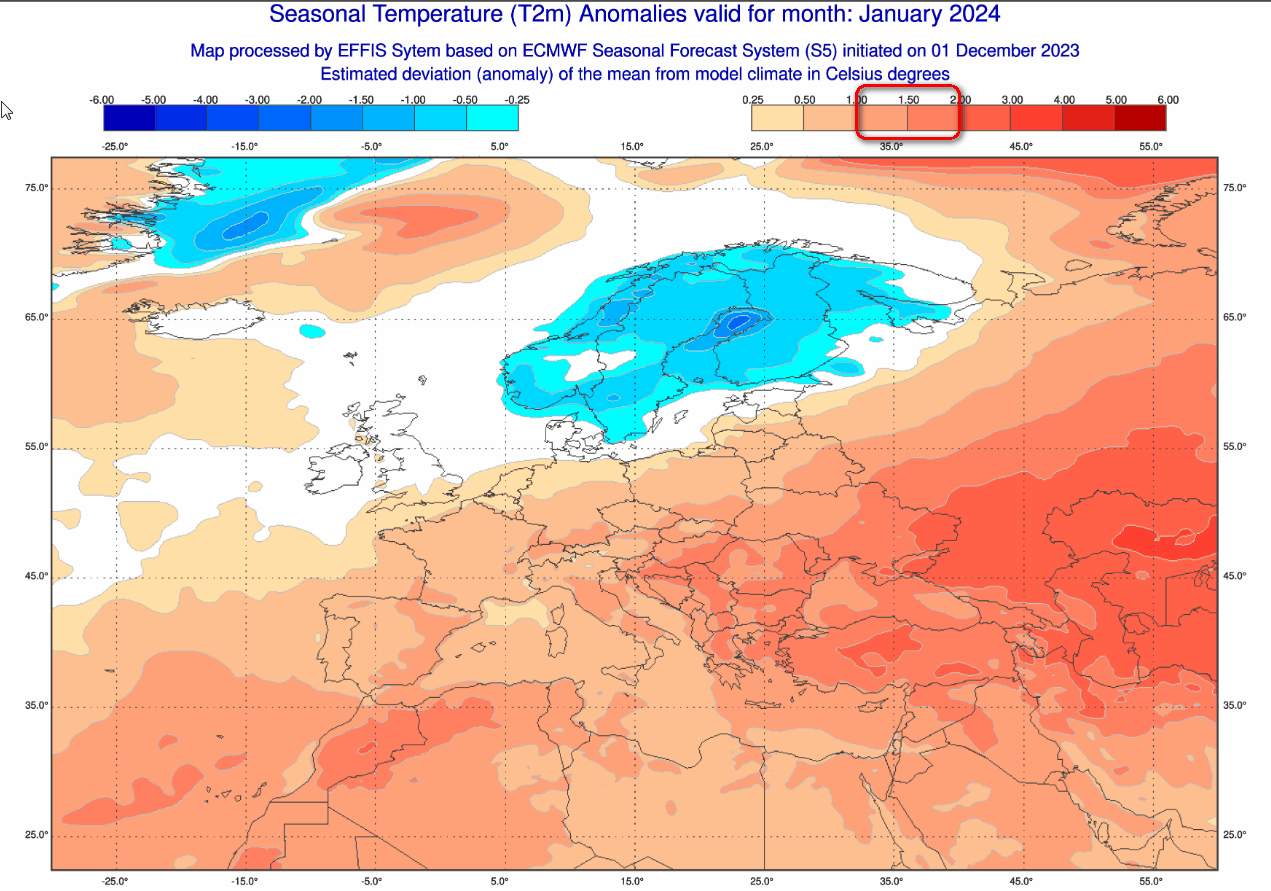 La prima mappa mostra il quadro delle anomalie termiche attese in Europa nell’arco di tutto il mese di gennaio 2024: