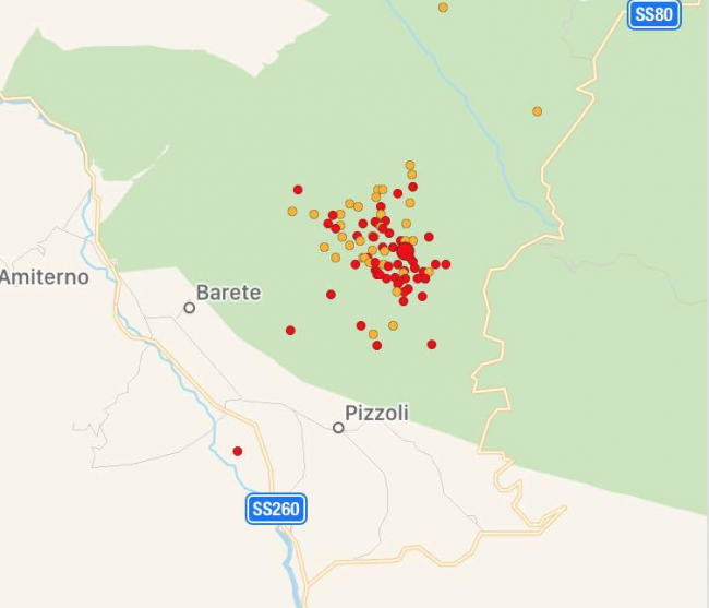 La zona interessata continua ad essere quella situata tra il fiume Aterno e i comuni di Pizzoli e Barete. Tuttavia negli ultimi giorni, dopo un periodo in cui l’intensità e il numero di scosse erano diminuite, l’attività della zona interessata è tornata nuovamente ad aumentare, numerose sono le scosse strumentali, diverse quelle avvertibili.