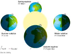 I solstizi e gli equinozi dividono il tragitto che la Terra compie attorno al Sole – detto “moto di rivoluzione” – in quattro parti uguali di tre mesi ciascuna: ognuna di quelle parti è una stagione.