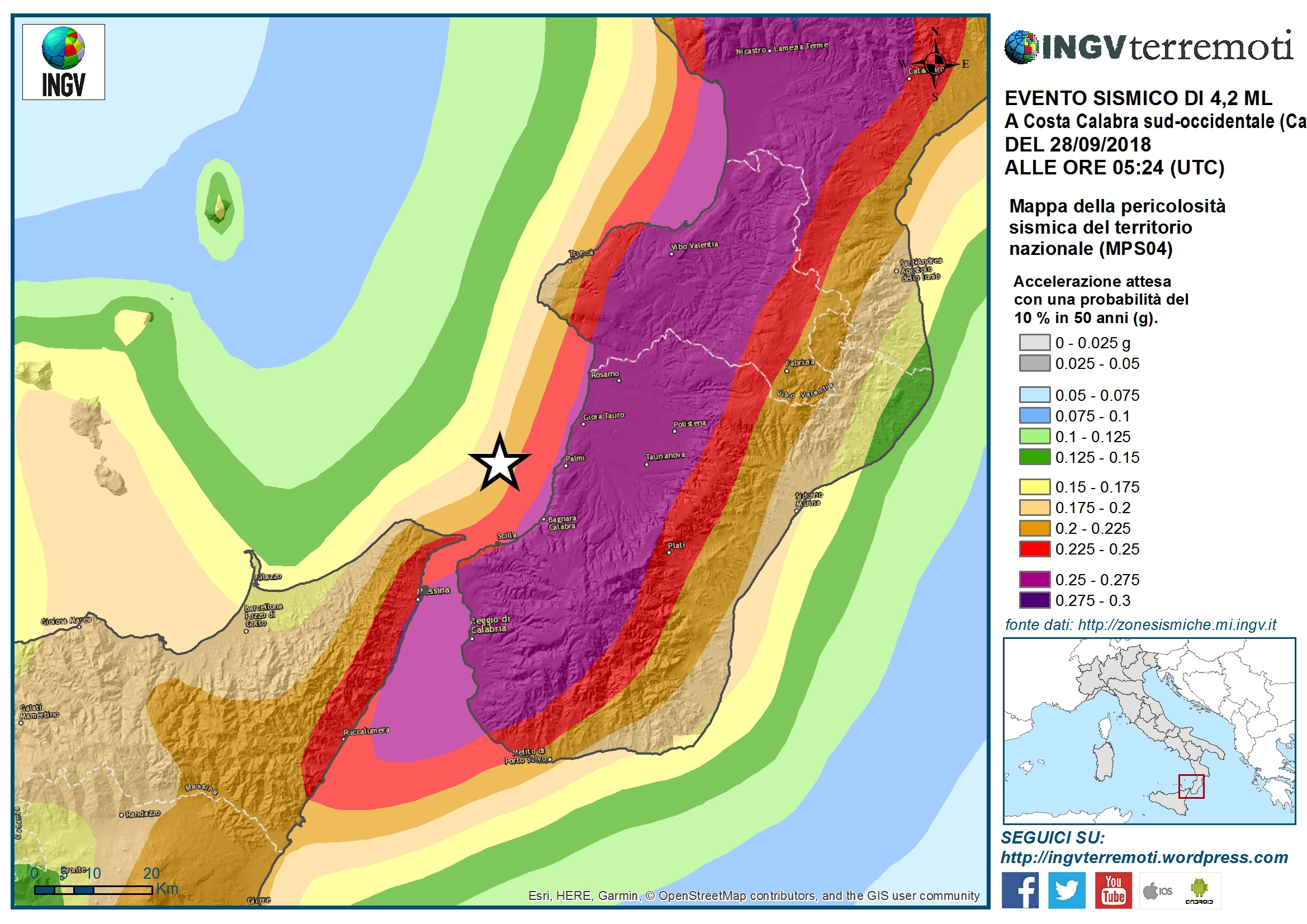 "Il terremoto di magnitudo ML 4.2 (Mw 4.0) avvenuto questa mattina, alle ore 7:24 italiane del 28 settembre 2018, è stato localizzato in mare, a largo della costa calabra sud occidentale, ad 11 km da Palmi, in provincia di Reggio Calabria. Le due città popolose più vicine sono Messina, a 26 km di distanza, e Reggio Calabria a 31 km.