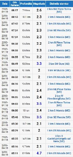 Dopo la scossa principale magnitudo 4.7 su scala Richter delle 5.11, sono numerose le scosse registrate, sia a carattere strumentale che superiori al 2° Richter. Ecco la tabella con i principali eventi sismici registrati dalla rete dell’INGV: