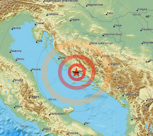 Stando ai dati provenienti dai sismografi del centro sismico EMCS si è trattato di un terremoto di magnitudo 4.5 (dato provvisorio) sulla scala richter con ipocentro fissato a circa 7 km di profondità. Epicentro individuato sulla Croazia meridionale, pochi chilometri a largo di Traù e Spalato. Il terremoto è stato nettamente avvertito nell’area epicentrale con forti tremori e boati per diversi secondi. Terremoto avvertito nettamente anche in Bosnia Erzegovina. Non risultano segnalazioni al momento dal centro Italia, non molto distante a linea d’aria dall’epicentro.