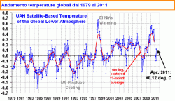 Al momento non sappiamo esattamente il motivo fisico, fatto sta che, secondo le ultimissime rilevazioni satellitari (grafico allegato in figura), le temperature globali del Pianeta nel mese di aprile hanno guadagnato 0,12°C, invertendo la tendenza al ribasso che si era impostata dai primi mesi de 2010.