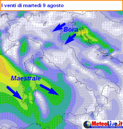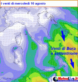 Infine il vento da nord (mappa qui a fianco) tenderà a smorzarsi a partire dal settentrione, indicando che ormai i contrasti saranno appianati e che l’estate potrà ripartire con una splendida fase di tempo soleggiato e gradevole fino alle porte di Ferragosto.