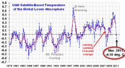 Lo chiariamo subito per non generare equivoci o malintesi: nessuna glaciazione in vista. La realtà dei fatti vede però le ultime rilevazioni satellitari che hanno individuato un inequivocabile calo del riscaldamento globale, con le temperature della bassa troposfera che sono scese nel mese di marzo fino a -0,10°C. Ricordiamo che i dati rilevati e qui presi in considerazione sono"puliti" dai possibili vizi di misurazione da parte delle stazioni a terra e vengono esclusivamente dalle rilevazioni del sensore satellitare Aqua.