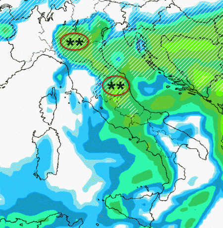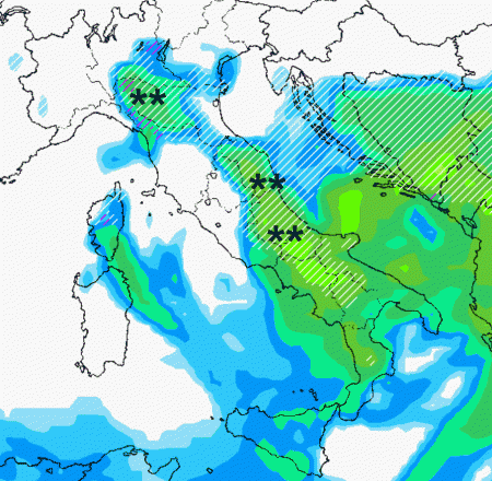 Nel pomeriggio-sera domenicale ancora situazione favorevole a nevicate su parte della Lombardia, dell’Emilia-Romagna e di Marche, Abruzzo e stavolta anche Molise, con fiocchi che potranno raggiungere anche il litorale del medio Adriatico: