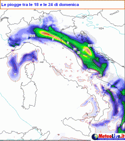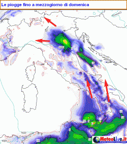 Frattanto sarà tornato a piovere anche al centro, con fenomeni sparsi ma spesso a sfondo temporalesco, meno frequenti su Toscana, Umbria e Marche. La perturbazione infatti si sarà per allora arcuata con perno proprio su queste ultime regioni e invierà una ritornante piovosa anche verso il settentrione. Già nel pomeriggio estensione dei rovesci a tutto il nord-est e, prima di sera, acqua su tutto il settentrione.