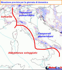 La mattina dispenserà generosi momenti di sole, ma non inganni. la coda di una perturbazione darà luogo ad una passata temporalesca nel pomeriggio su est Lombardia, Triveneto, Emilia, Romagna e su tutte le zone interne del centro-sud, fino alla Basilicata.