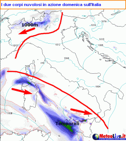 Il tempo di questa domenica sarà affidato all’azione di un centro di bassa pressione, il cui minimo principale è già nei pressi dello Ionio, mentre un minimo secondario ha preso forma sui nostri mari di ponente in direzione del basso Tirreno. Ecco quindi la presenza di due corpi nuvolosi principali, l’uno attivo al nord, l’altro tra le Isole e l’estremo sud.