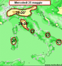 Ecco la previsione delle temperature in Italia per la giornata di mercoledì 25 maggio.