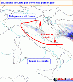 La coda di una perturbazione in transito sui Balcani apporterà qualche disturbo nel pomeriggio di domenica lungo l'Adriatico e nelle zone interne appenniniche del centro-sud.