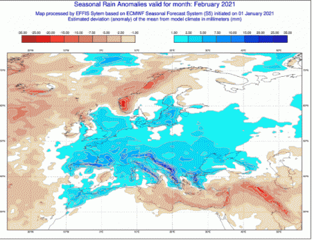 Come vedete, secondo il prestigioso centro di calcolo ECMWF, avremo un febbraio tutt’altro che secco…anzi, sarebbe più piovoso della norma con picchi di precipitazioni notevoli lungo il versante tirrenico. Si tratterà ovviamente non solo di pioggia, ma anche di neve dove le temperature lo consentiranno, quindi sicuramente sui rillievi.
