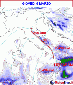 In particolare: le correnti orientali addenseranno nubi in Adriatico, con qualche pioggia lungo le coste e deboli nevicate tra i 700 e i 900 metri sui rilievi delle Marche, dell’Abruzzo e del Molise.