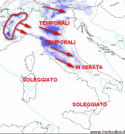 Il nord-ovest avrà qualche temporale al mattino, seguito da un miglioramento solo temporaneo. Tra il pomeriggio e la serata, come mostrano le frecce, nuovi nuclei instabili partiranno dalle Alpi ed invaderanno le pianure del Piemonte ed ovest Lombardia.