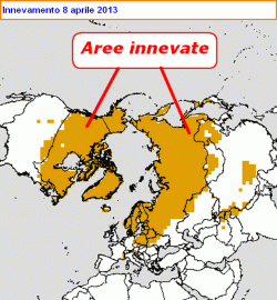 E’ stato l’inverno delle sorprese ma lo è ancor più la primavera, dato che i dati di oggi, 8 aprile 2013, sono sbalorditivi: osservate la prima mappa in alto, vi sono rappresentate in colore le aree continentali ancora ricoperte di neve. Badate bene a quanta neve c’è ancora in Europa: Regione scandinava tutta bianca, Europa orientale tutta bianca.