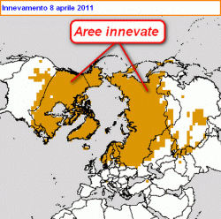 Direte: "Ok, ma facciamo un raffronto con la norma del periodo". Bene per prima cosa vi proponiamo la stessa figura (subito sotto alla prima) ma riferita all’innevamento registrato dai satelliti l’8 aprile 2011. Già l’occhio fa la sua parte, soprattutto per quanto riguarda l’Europa in quei giorni decisamente più in veste primaverile rispetto ad