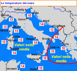 Proprio questo bacino, non particolarmente vasto ne profondo, ha abbassato la sua temperatura di quasi 3°C in 10 giorni. Ora siamo arrivati a 10°C in mare aperto tra Trieste e il Lido di Venezia. Su tutti gli altri nostri bacini si misurano temperature comprese tra i 13 °C del mar Ligure, Tirreno centro-settentrionale, mare di Sardegna e Adriatico centrale, ai 14°C del basso Tirreno e del Canale di Sardegna fino ai 15°C del Canale di Sicilia, Ionio e basso Adriatico.