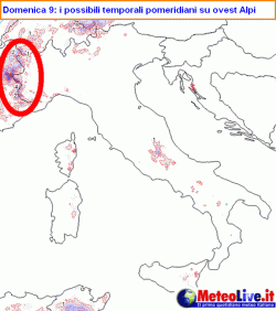 Nel pomeriggio non sono previste sostanziali variazioni su gran parte del Paese, fatta eccezione per qualche addensamento cumuliforme che andrà sviluppandosi sulle zone montuose. Questi addensamenti potranno sfociare in isolati e brevi episodi temporaleschi sulle Alpi occidentali, in particolare sui settori piemontesi che comprendono le Cozie e le Graie.