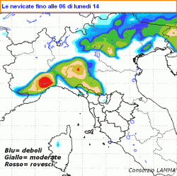Neve anche nei fondovalle alpini su Lombardia, Trentino, Alto Adige (debole qui), Veneto e Friuli Venezia Giulia, oltre che su quelli appenninici emiliano, intorno i 300-500 metri in Romagna e intorno a 400-500 metri sul resto della Liguria.