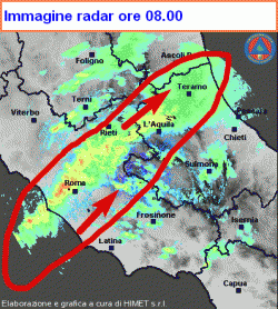 Nell’immagine possiamo vedere il brusco risveglio autunnale su Lazio e Abruzzo grazie ad una scansione radar che mette in evidenza le precipitazioni in atto alle ore 08.00 e la direzione di spostamento prevista della struttura temporalesca.