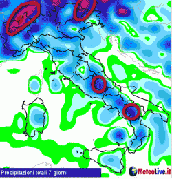 La mappa che vi abbiamo allegato è molto chiara nella sua lettura e interpretazione. Essa ci segnala i settori del nostro Paese dove pioverà di più nel corso dei prossimi sette giorni. Detto in altre parole, una settimana di piogge in una sola mappa.