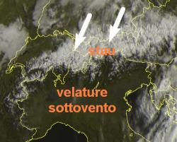 I venti freddi da NNE che ancora insistono in quota, favoriscono annuvolamenti anche intensi lungo lo spartiacque alpino centro-orientale, dove infatti si registrano ancora nevicate sino a 1500m, con temperature appena al di sotto dello zero.