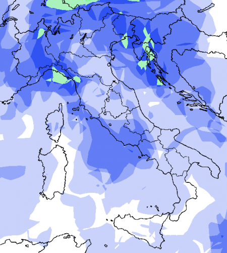 Ed ecco una mappa relativa alla probabilità di pioggia superiore ai 5mm prevista dal modello americano per mercoledì 11 ottobre, in blu siamo attorno al 35-40% di probabilità, in verde al 45-55%: